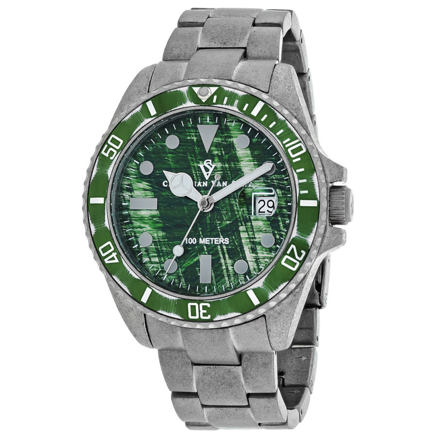 Silver-tone stainless steel case and bracelet. Green stainless steel bezel. Green dial with silver-tone hands and index hour markers. Minute markers around the outer rim. Dial Type: Analog. Date display at the 3 o'clock position. Quartz movement. Scratch resistant mineral crystal. Round case shape, case size: 44 mm. Band width: 20 mm. Fold over clasp. Water resistant at 100 meters / 330 feet. Functions: date, hour, minute, second. Montego Vintage Series. Fashion watch style. Christian Van Sant Montego Vintage Quartz Green Dial Mens Watch CV5102.