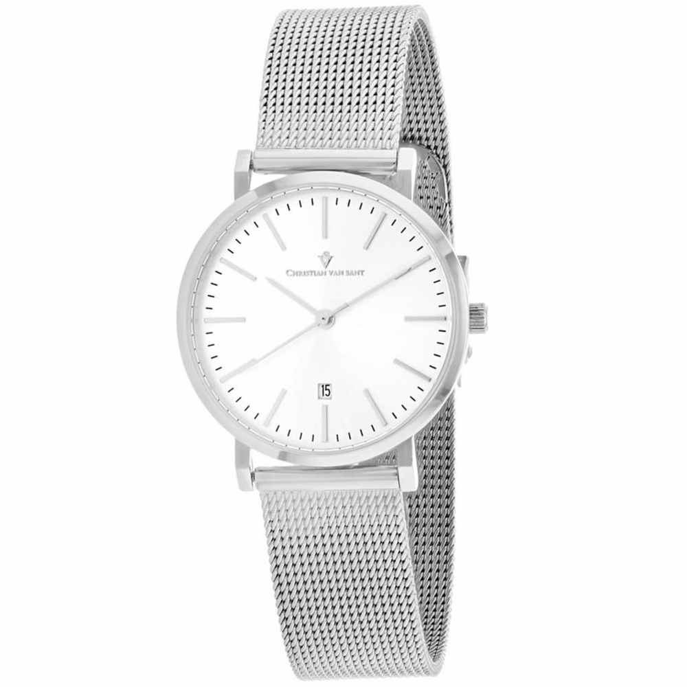 Silver-tone stainless steel case and bracelet. Fixed silver-tone stainless steel bezel. Silver-tone dial with silver-tone hands and index hour markers. Minute markers around the outer rim. Dial Type: Analog. Date display at the 6 o'clock position. Quartz movement. Scratch resistant mineral crystal. Round case shape, case size: 32 mm, case thickness: 7 mm. Band width: 15 mm, band length: 7.5 inches. Fold over clasp with a safety release. Water resistant at 3 meters / 10 feet. Functions: date, hour, minute, second. Paradigm Series. Fashion watch style. Christian Van Sant Paradigm Quartz Silver Dial Ladies Watch CV4223.