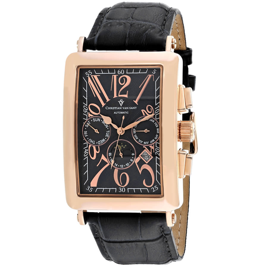 Rose gold-tone stainless steel case with a black leather strap. Fixed rose gold-tone bezel. Black dial with rose gold-tone hands and Arabic numeral hour markers. Arabic numeral minute markers (at 5 minute intervals). Arabic numeral minute markers (at 5 minute intervals). Minute markers around the outer rim. Dial Type: Analog. Date display between the 4 and 5 o'clock positions. Three multi-function sub-dials displaying: 24 hours, date and 24 hours / moonphase. Automatic movement. Scratch resistant mineral crystal. Solid case back. Rectangle case shape. Case size: 52 mm. Case thickness: 14.2 mm. Band width: 23 mm. Tang clasp. Water resistant at 50 meters / 165 feet. Functions: date, day, hour, minute, second, moonphase. Prodigy Series. Fashion watch style. Christian Van Sant Prodigy Black Dial Mens Watch CV9141.