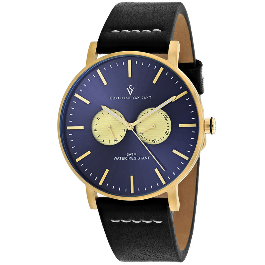 Yellow gold-tone stainless steel case with a black leather strap. Fixed yellow gold-tone stainless steel bezel. Blue dial with yellow gold-tone hands and index hour markers. Minute markers around the outer rim. Dial Type: Analog. Quartz movement. Scratch resistant mineral crystal. Round case shape, case size: 44 mm. Band width: 20 mm. Buckle clasp. Water resistant at 30 meters / 100 feet. Functions: date, day, hour, minute, second. Relic Series. Fashion watch style. Christian Van Sant Relic Quartz Blue Dial Mens Watch CV0540.