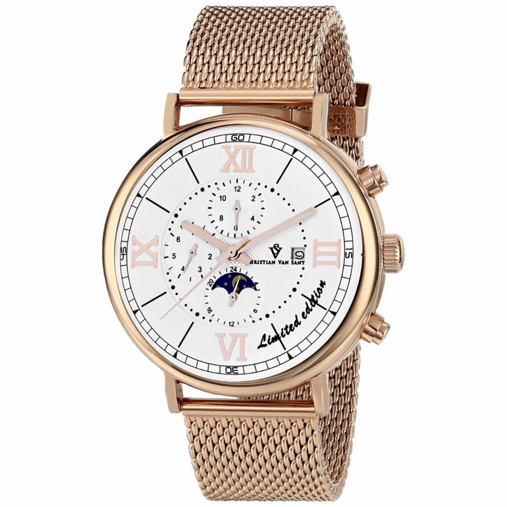 Rose gold-tone stainless steel case and bracelet. Fixed rose gold-tone stainless steel bezel. White dial with rose gold-tone hands and Roman numeral hour markers. Minute markers around the outer rim. Dial Type: Analog. Date display at the 3 o'clock position. Automatic movement. Scratch resistant mineral crystal. Round case shape, case size: 46 mm, case thickness: 14 mm. Band width: 21 mm, band length: 7.5 inches. Fold over clasp with a safety release. Water resistant at 100 meters / 330 feet. Functions: chronograph, date, hour, minute, second. Somptueuse Ltd Series. Fashion watch style. Christian Van Sant Somptueuse LTD Chronograph Automatic White Dial Mens Watch CV1153.