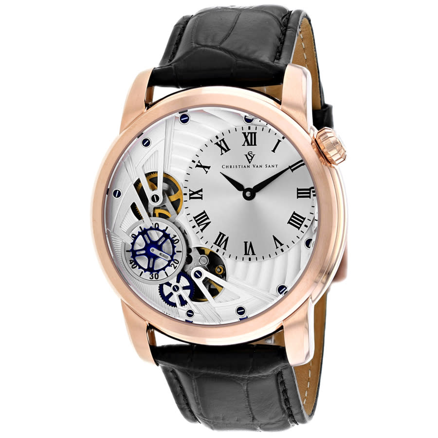 Rose gold-tone stainless steel case with a black (croco-embossed) leather strap. Fixed rose gold-tone bezel. Silver (open heart) dial with black hands and Roman numeral hour markers. Minute markers around the outer rim. Dial Type: Analog. Small seconds sub-dial. Auto-quartz movement. Scratch resistant mineral crystal. Pull / push crown. Solid case back. Round case shape. Case size: 46 mm. Case thickness: 14 mm. Band width: 24 mm. Tang clasp. Water resistant at 100 meters / 330 feet. Functions: hour, minute, second. Sprocket Auto-quartz Series. Fashion watch style. Christian Van Sant Sprocket Auto-Quartz Silver Dial Mens Watch CV1545.