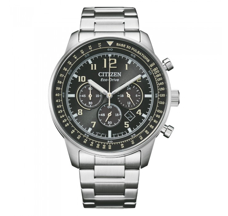 Silver-tone stainless steel case and bracelet. Fixed silver-tone bezel. Black dial with silver-tone hands and Arabic numeral hour markers. Dial Type: Analog. Date display between 4 and 5 o'clock position. Chronograph - sub-dials displaying: 24 hours, 60 minutes, 60 seconds. Citizen Caliber B620 eco-drive movement. Scratch resistant mineral crystal. Solid case back. Round case shape, case size: 44 mm, case thickness: 13 mm. Deployment clasp. Water resistant at 100 meters / 330 feet. Functions: chronograph, date, hour, minute, second, base 30 pulsations. Watch label: Japan Movt. Citizen Chronograph Eco-Drive Black Dial Mens Watch CA4500-83E.