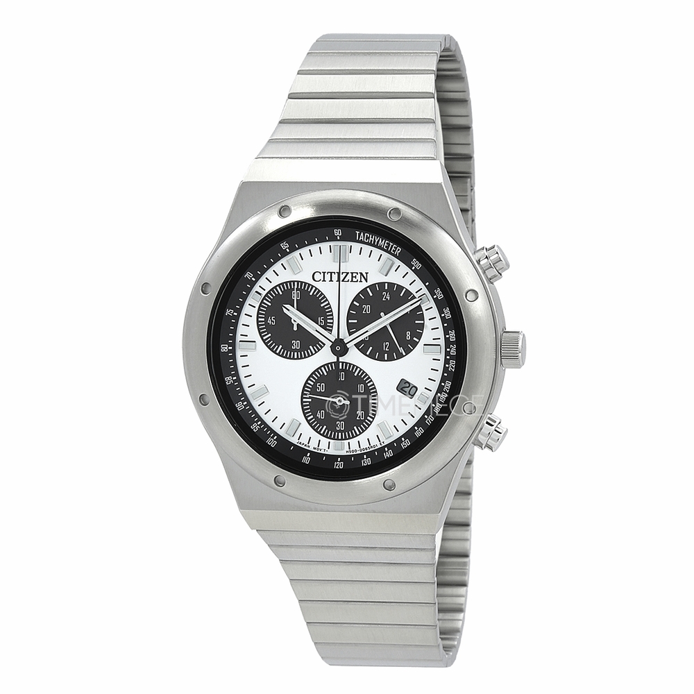 Silver-tone stainless steel case and bracelet. Fixed silver-tone stainless steel bezel. White dial with silver-tone hands and index hour markers. Minute markers around the outer rim. Dial Type: Analog. Date display at the 4 o'clock position. Chronograph - three sub-dials displaying: 60 second, 60 minute and 24 hour. Citizen Calibre H500 quartz movement. Scratch resistant crystal glass crystal. Solid case back. Round case shape, case size: 38 mm, case thickness: 9.5 mm. Fold over clasp with a safety release. Water resistant at 50 meters / 165 feet. Functions: chronograph, date, hour, minute, second. Sport watch style. Watch label: Japan Movt. Citizen Chronograph Quartz White Dial Mens Watch AT2541-54A.