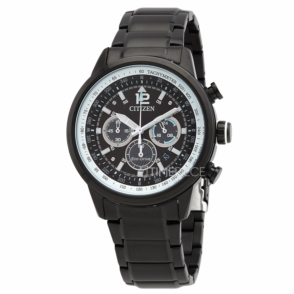 Pvd black stainless steel case and bracelet. Fixed PVD black stainless steel bezel. Black dial with silver-tone hands and Arabic numeral, index hour markers. Tachymeter scale around the outer rim. Dial Type: Analog. Luminescent hands and markers. Date display between 4 and 5 o'clock position. Chronograph - three sub-dials displaying: 24 hours, 60 minutes, 60 seconds. Citizen Caliber B620 eco-drive movement with a 270-day power reserve. Scratch resistant mineral crystal. Screw down crown. Solid case back. Round case shape, case size: 44 mm, case thickness: 13 mm. Band width: 22 mm. Deployment with push button release clasp. Water resistant at 100 meters / 330 feet. Functions: chronograph, date, hour, minute, second. Chronograph Series. Sport watch style. Watch label: Japan Movt. Citizen Chronograph Black Dial Mens Watch CA4475-89E.