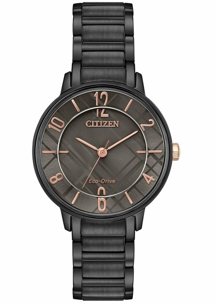 Black-plated stainless steel case and bracelet. Fixed black-plated bezel. Black dial with rose gold-tone hands and alternating Arabic numeral and index hour markers. Dial Type: Analog. Citizen caliber Eco-Drive E031 eco-drive movement. Scratch resistant mineral crystal. Pull / push crown. Solid case back. Round case shape. Case size: 30.8 mm. Case thickness: 9 mm. Band width: 13 mm. Fold over clasp. Water resistant at 50 meters / 165 feet. Functions: hour, minute, second. Eco-drive Series. Casual watch style. Watch label: Japan Movt. Citizen Eco-Drive Black Dial Black-plated Ladies Watch EM0528-82H.