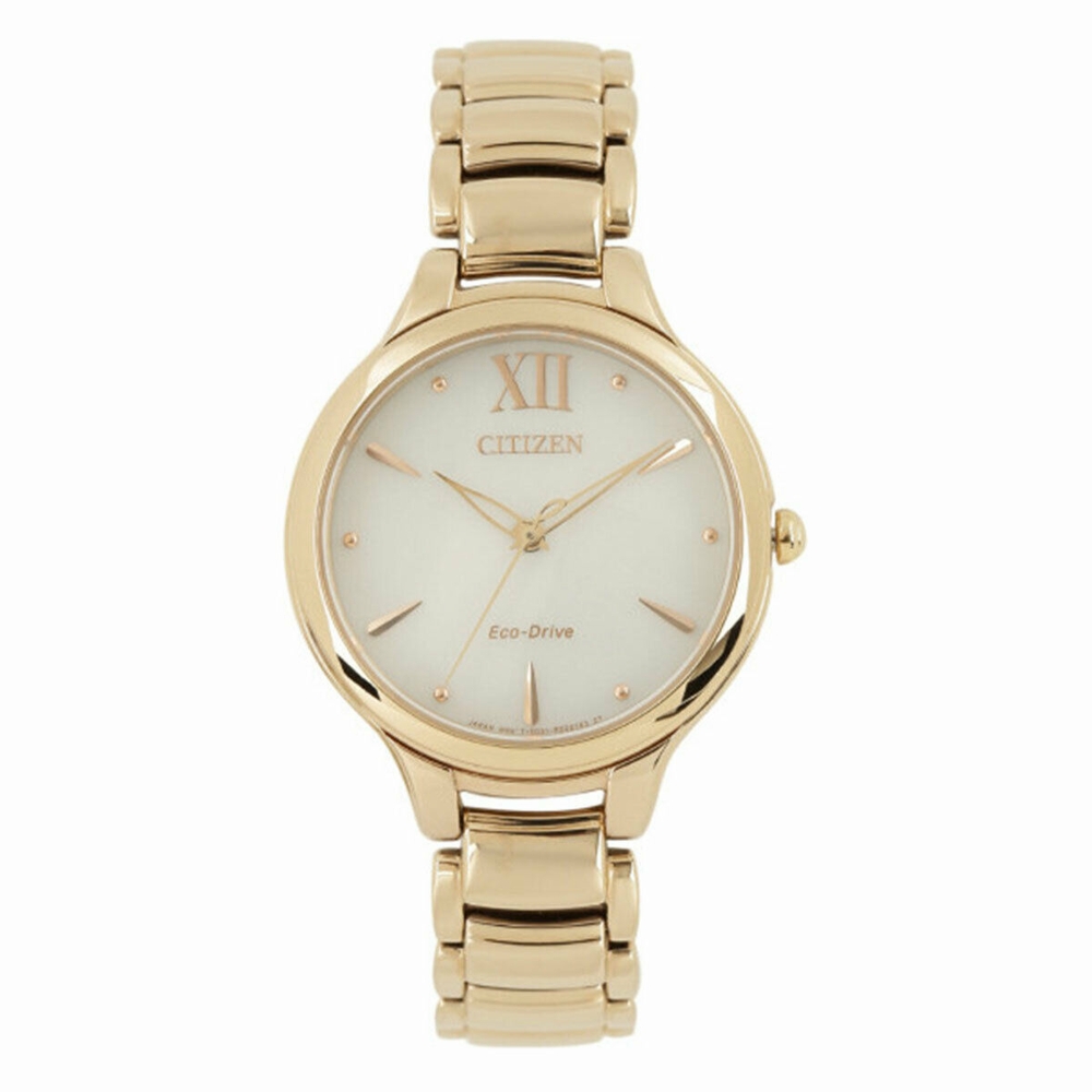 Rose gold-tone stainless steel case and bracelet. Fixed gold-tone stainless steel bezel. White dial with rose gold-tone hands and Roman numeral/index hour markers. Dial Type: Analog. Citizen Caliber Eco-Drive E031 eco-drive movement. Scratch resistant sapphire crystal. Pull / push crown. Solid case back. Round case shape, case size: 32 mm. Water resistant at 50 meters / 165 feet. Functions: hour, minute, second. Eco-drive Series. Casual watch style. Watch label: Japan Movt. Citizen Eco-Drive White Dial Ladies Watch EM0553-85A.