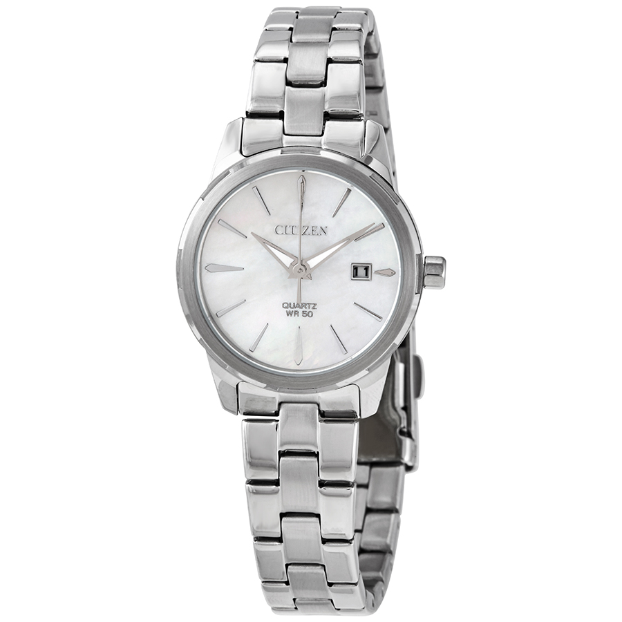 Stainless steel case with a stainless steel bracelet. Fixed stainless steel bezel. Mother of pearl dial with luminous silver-tone hands and index hour markers. Dial Type: Analog. Luminescent hands. Date display at the 3 o'clock position. Quartz movement. Scratch resistant mineral crystal. Pull / push crown. Solid case back. Round case shape. Case size: 28 mm. Case thickness: 7.5 mm. Band width: 12.5 mm. Deployment clasp. Water resistant at 50 meters / 165 feet. Functions: date, hour, minute, second. Casual watch style. Watch label: Japan Movt. Citizen Elegance Mother of Pearl Dial Ladies Watch EU6070-51D.