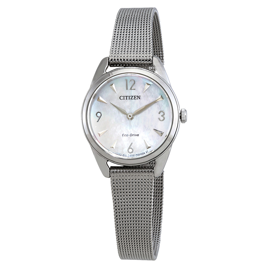 Stainless steel case with a stainless steel mesh bracelet. Fixed stainless steel bezel. Mother of pearl dial with silver-tone hands and index hour markers. Arabic numerals appear at the 3, 6, 9 and 12 o'clock positions. Dial Type: Analog. Citizen caliber E031 eco-drive movement. Scratch resistant mineral crystal. Pull / push crown. Solid case back. Round case shape. Case size: 27 mm. Case thickness: 9 mm. Band width: 11 mm. Slip through clasp. Functions: hour, minute, second. Additional Info: powered by light. Casual watch style. Watch label: Japan Movt. Citizen LTR Eco-Drive Mother of Pearl Dial Ladies Watch EM0680-53D.