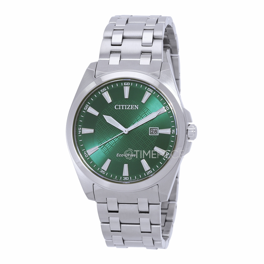 Silver-tone stainless steel case and bracelet. Fixed silver-tone stainless steel bezel. Green dial with silver-tone hands and index hour markers. Minute markers around the outer rim. Dial Type: Analog. Luminescent hands and markers. Date display at the 3 o'clock position. Citizen Caliber Eco-Drive E111 eco-drive movement. Scratch resistant sapphire crystal. Solid case back. Round case shape, case size: 41 mm. Band width: 22 mm. Fold over clasp with a safety release. Water resistant at 100 meters / 330 feet. Functions: date, hour, minute, second, solar-powered. Peyten Series. Dress watch style. Watch label: Japan Movt. Citizen Peyten Eco-Drive Green Dial Mens Watch BM7530-50X.