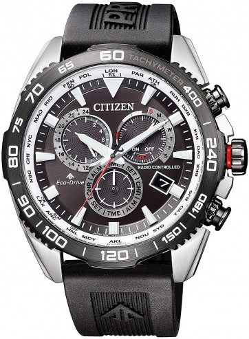 Stainless steel case with a black (synthetic) rubber strap. Fixed black-plated bezel showing tachymeter markings. Black dial with silver-tone hands and index hour markers. Minute markers. World time cities around the outer rim. Dial Type: Analog. Luminescent hands and markers. Date display at the 4 o'clock position. linea days of the week,. Chronograph - three sub-dials displaying: 12 hours, 24 hours (alarm) and function. Citizen caliber E660 eco-drive movement. Scratch resistant sapphire crystal. Solid case back. Round case shape. Case size: 44.6 mm. Case thickness: 12.6 mm. Band width: 22 mm. Tang clasp. Water resistant at 200 meters / 660 feet. Functions: chronograph, tachymeter,date, hour, minute, second, radio controlled, alarm, daylight saving function, world time. Promaster Series. Sport watch style. Watch label: Japan Movt. Citizen Promaster Alarm World Time Chronograph Black Dial Mens Eco-Drive Watch CB5036-10X.