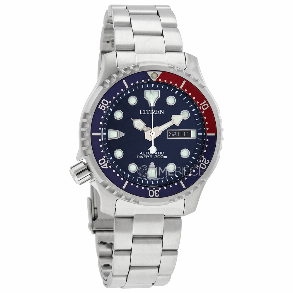 Stainless steel case with a stainless steel bracelet. Uni-directional rotating stainless steel bezel with an inalid blue and red ring. Blue dial with luminous silver-tone hands and dot hour markers. Minute markers around the outer rim. Dial Type: Analog. Luminescent hands and markers. Day of the week and date display at the 3 o'clock position. Citizen caliber 8203 automatic movement. Scratch resistant mineral crystal. Screw down crown. Solid case back. Round case shape. Case size: 42 mm. Case thickness: 12 mm. Band width: 21 mm. Deployment clasp. Water resistant at 200 meters / 660 feet. Functions: date, day, hour, minute, second. Promaster Series. Casual watch style. Watch label: Japan Movt. Citizen Promaster Automatic Blue Dial Mens Watch NY0086-83L.