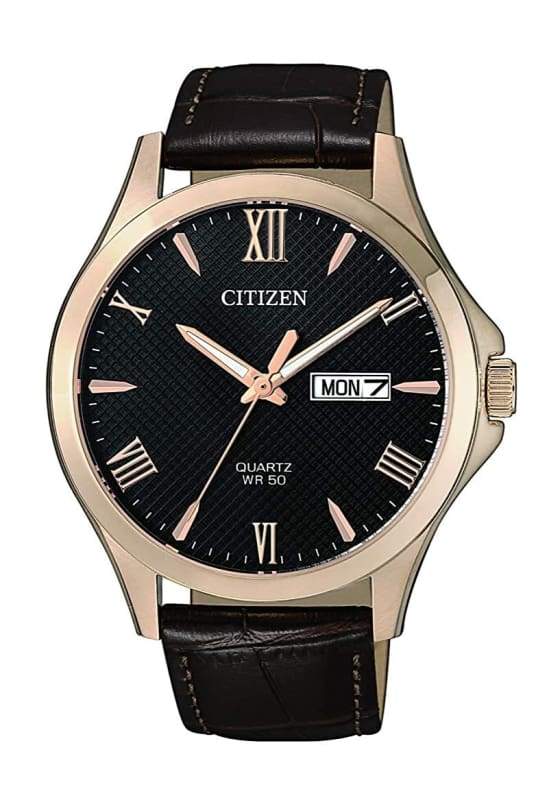 Rose gold-tone stainless steel case with a brown leather strap. Fixed rose gold-tone bezel. Black dial with luminous rose gold-tone hands and alternating Roman numeral and index hour markers. Minute markers around the outer rim. Dial Type: Analog. Luminescent hands. Day of the week and date display at the 3 o'clock position. Citizen caliber 1502 quartz movement. Scratch resistant mineral crystal. Pull / push crown. Solid case back. Round case shape. Case size: 41 mm. Case thickness: 9 mm. Band width: 21 mm. Tang clasp. Water resistant at 50 meters / 165 feet. Functions: date, day, hour, minute, second. Dress watch style. Watch label: Japan Movt. Citizen Quartz Black Dial Brown Leather Mens Watch BF2023-01H.