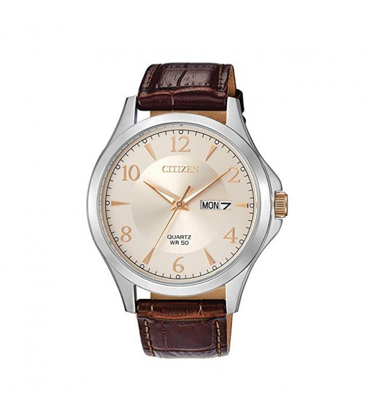 Stainless steel case with a brown leather strap. Fixed stainless steel bezel. Champagne dial with luminous rose gold-tone hands and alternating Arabic numeral and index hour markers. Minute markers around the outer rim. Dial Type: Analog. Luminescent hands. Day of the week and date display at the 3 o'clock position. Quartz movement. Scratch resistant mineral crystal. Pull / push crown. Solid case back. Round case shape. Case size: 41 mm. Case thickness: 9 mm. Band width: 21 mm. Tang clasp. Water resistant at 50 meters / 165 feet. Functions: date, day, hour, minute, second. Casual watch style. Citizen Quartz Champagne Dial Brown Leather Mens Watch BF2009-29X.