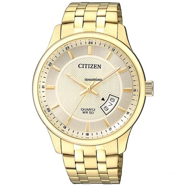 Gold-tone stainless steel case and bracelet. Fixed gold-tone bezel. Gold dial with luminous gold-tone hands and index hour markers. Arabic numeral minute markers (at 5 minute intervals). Minute markers around the outer rim. Dial Type: Analog. Luminescent hands and markers. Date display at the 4 o'clock position. Caliber 1112 quartz movement. Scratch resistant mineral crystal. Pull / push crown. Solid case back. Round case shape. Case size: 40 mm. Case thickness: 9 mm. Band width: 20 mm. Fold over clasp with a push button release. Water resistant at 50 meters / 165 feet. Functions: date, hour, minute, second. Dress watch style. Citizen Quartz Gold Dial Gold-tone Mens Watch BI1052-85P.