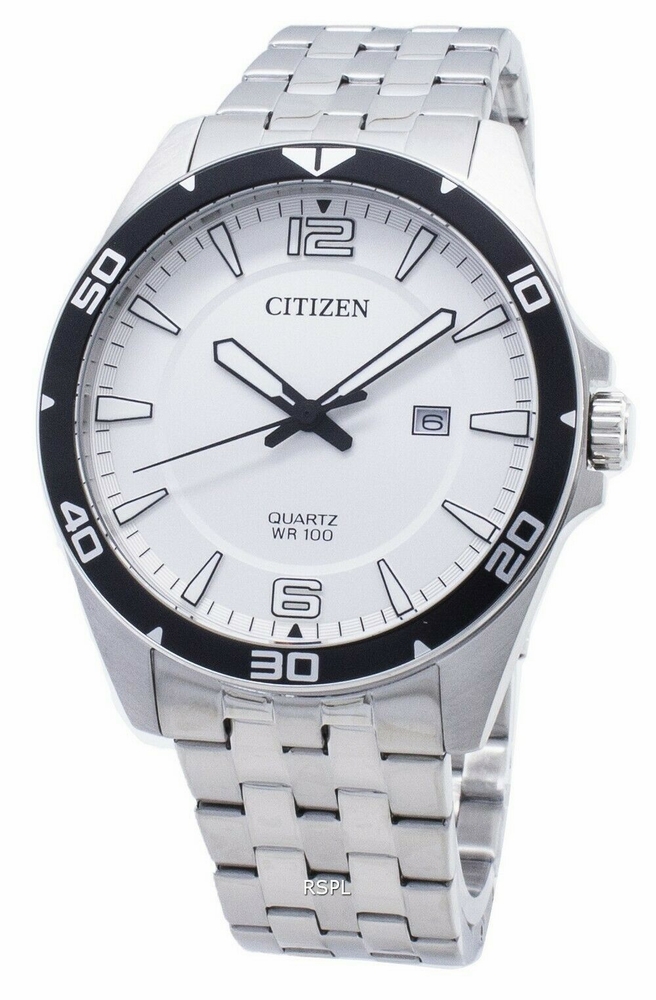 Stainless steel case with a stainless steel bracelet. Fixed stainless steel bezel. White dial with luminous black hands and index hour markers. Arabic numerals appear at the 6 and 12 o'clock positions. Minute markers around the outer rim. Dial Type: Analog. Luminescent hands and markers. Date display at the 3 o'clock position. Citizen caliber G111 quartz movement. Scratch resistant mineral crystal. Pull / push crown. Solid case back. Round case shape. Case size: 42 mm. Case thickness: 10 mm. Band width: 22 mm. Fold over clasp with a push button release. Water resistant at 100 meters / 330 feet. Functions: date, hour, minute, second. Casual watch style. Citizen Quartz White Dial Stainless Steel Mens Watch BI5051-51A.