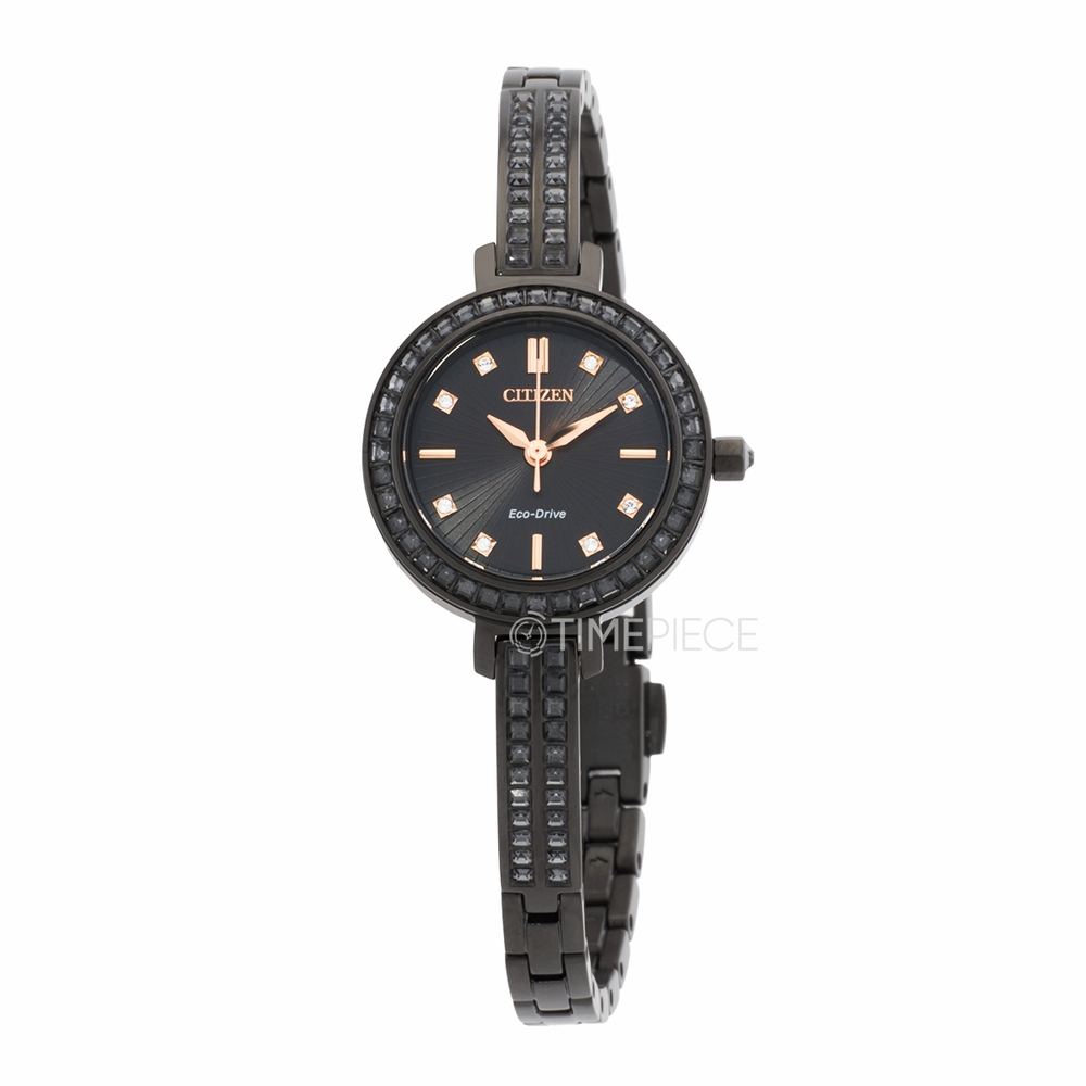 Black stainless steel case and bracelet set with crystals. Fixed black stainless steel bezel set with crystals. Black dial with rose gold-tone hands and crystal-index hour markers. Dial Type: Analog. Citizen Caliber E031 eco-drive movement. Scratch resistant mineral crystal. Solid case back. Round case shape, case size: 25 mm. Band width: 6 mm. Jewelry clasp. Water resistant at 50 meters / 165 feet. Functions: hour, minute, second, solar-powered. Silhouette Crystal Series. Dress watch style. Watch label: Japan Movt. Citizen Silhouette Crystal Black Dial Ladies Watch EM0865-58E.