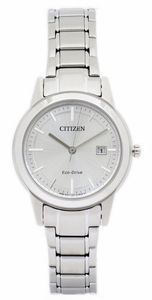 Silver-tone stainless steel case and bracelet. Fixed silver-tone bezel. Silver dial with silver-tone hands and index hour markers. Dial Type: Analog. Date display at the 3 o'clock position. Eco-drive movement. Scratch resistant mineral crystal. Pull / push crown. Solid case back. Round case shape, case size: 29.4 mm, case thickness: 8.3 mm. Deployment clasp. Water resistant at 50 meters / 165 feet. Functions: date, hour, minute, second. Watch label: Japan Movt. Citizen Silver Dial Ladies Watch FE1081-59A.