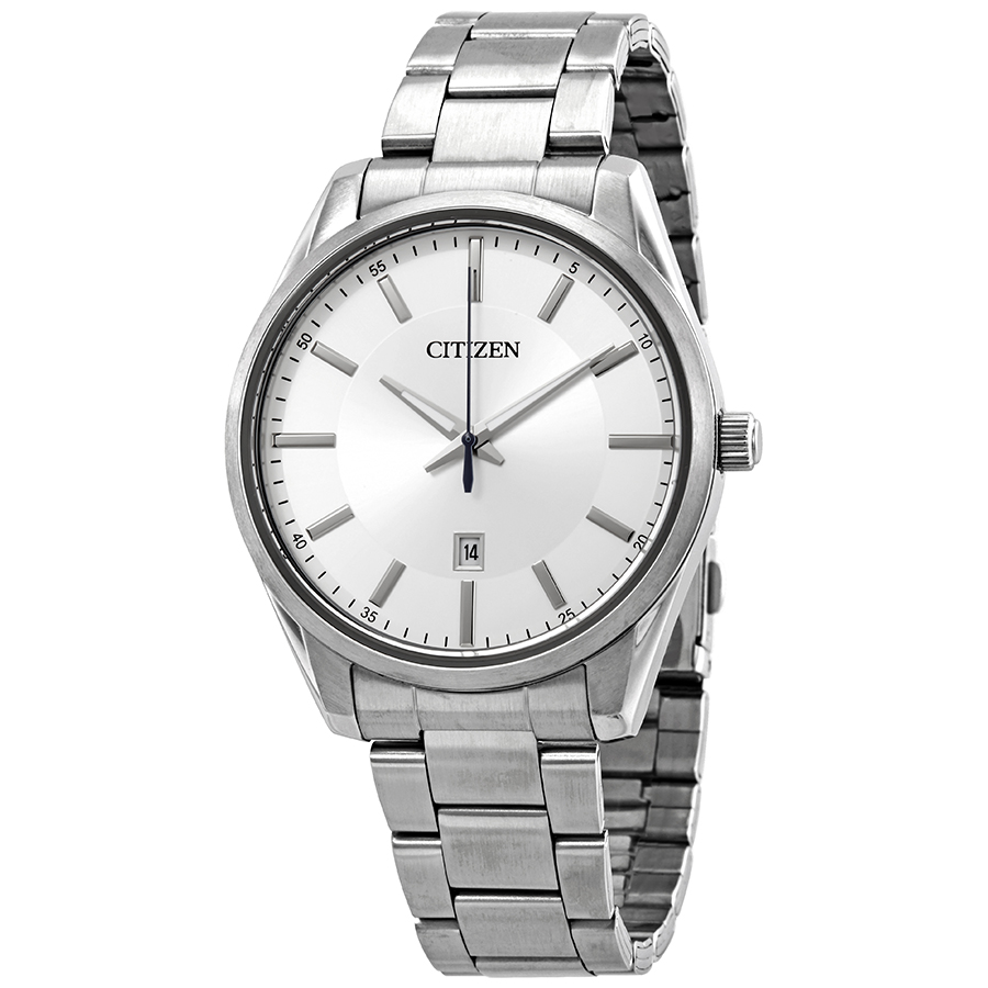 Stainless steel case with a stainless steel bracelet. Fixed stainless steel bezel. Silver dial with luminous silver-tone hands and index hour markers. Arabic numeral minute markers (at 5 minute intervals). Minute markers around the outer rim. Dial Type: Analog. Luminescent hands. Date display above the 6 o'clock position. Quartz movement. Scratch resistant mineral crystal. Pull / push crown. Solid case back. Round case shape. Case size: 42 mm. Case thickness: 9 mm. Band width: 20 mm. Fold over clasp with a push button release. Water resistant at 30 meters / 100 feet. Functions: date, hour, minute, second. Casual watch style. Watch label: Japan Movt. Citizen Quartz Silver Dial Stainless Steel Mens Watch BI1030-53A.