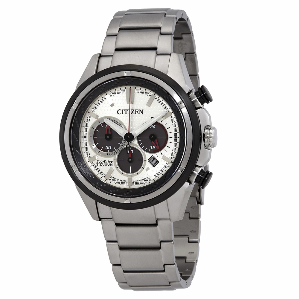 Grey titanium case with a grey titanium bracelet. Fixed black- grey titanium bezel. Silver dial with silver-tone hands and index hour markers. Minute markers around the outer rim. Dial Type: Analog. Luminescent hands. Date display between 4 and 5 o'clock position. Chronograph - sub-dials displaying: three - 60 second, 60 minute and 24 hours. Citizen Caliber Eco-Drive B620 eco-drive movement. Scratch resistant sapphire crystal. Solid case back. Round case shape. Case size: 46 mm. Water resistant at 100 meters / 330 feet. Functions: chronograph, date, hour, minute, second, solar-powered. Sport watch style. Watch label: Japan Movt. Citizen Silver Dial Eco-Drive Super Titanium Chronograph Watch CA4241-55A.