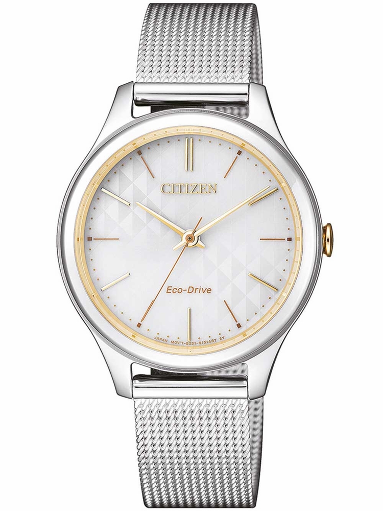 Stainless steel case with a stainless steel mesh bracelet. Fixed stainless steel bezel with a gold-tone ring. White dial with gold-tone hands and index hour markers. Minute markers around the outer rim. Dial Type: Analog. Citizen caliber E031 eco-drive movement. Scratch resistant mineral crystal. Pull / push crown. Solid case back. Round case shape. Case size: 32 mm. Case thickness: 7.3 mm. Band width: 14 mm. Fold over slip through clasp. Water resistant at 50 meters / 165 feet. Functions: hour, minute, second. Dress watch style. Watch label: Japan Movt. Citizen White Dial Eco-Drive White Dial Ladies Watch EM0504-81A.