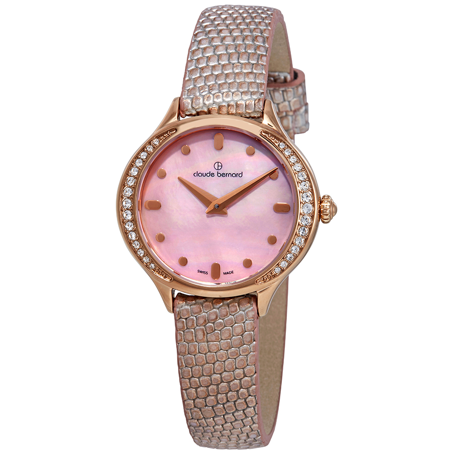 Rose gold-tone stainless steel case with a pink (snake skin pattern) leather strap. Fixed rose gold-tone bezel set with crystals. Pink mother of pearl dial with rose gold-tone hands and dot hour markers. Index markers at the 3, 6, 9 and 12 o'clock positions. Dial Type: Analog. Quartz movement. Scratch resistant sapphire crystal. Pull / push crown. Solid case back. Round case shape. Case size: 32 mm. Band width: 15 mm. Tang clasp. Water resistant at 30 meters / 100 feet. Functions: hour, minute. Dress watch style. Watch label: Swiss Made. Claude Bernard Ladies Watch 20217 37RP NARIR.