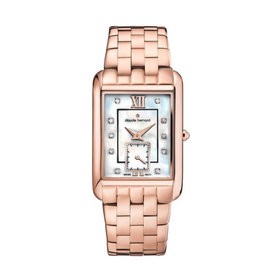 Stainless steel case with a stainless steel bracelet. Fixed bezel. Mother of pearl dial with rose gold-tone hands and crystals hour markers. Dial Type: Analog. One- small seconds subdials. Quartz movement. Scratch resistant sapphire crystal. Pull / push crown. Solid case back. Rectangle case shape. Case size: 30 x 27 mm. Water resistant at 30 meters / 100 feet. Functions: hour, minute, second. Dress watch style. Watch label: Swiss Made. Claude Bernard Crystal Ladies Watch 23097 37RM NAPR.
