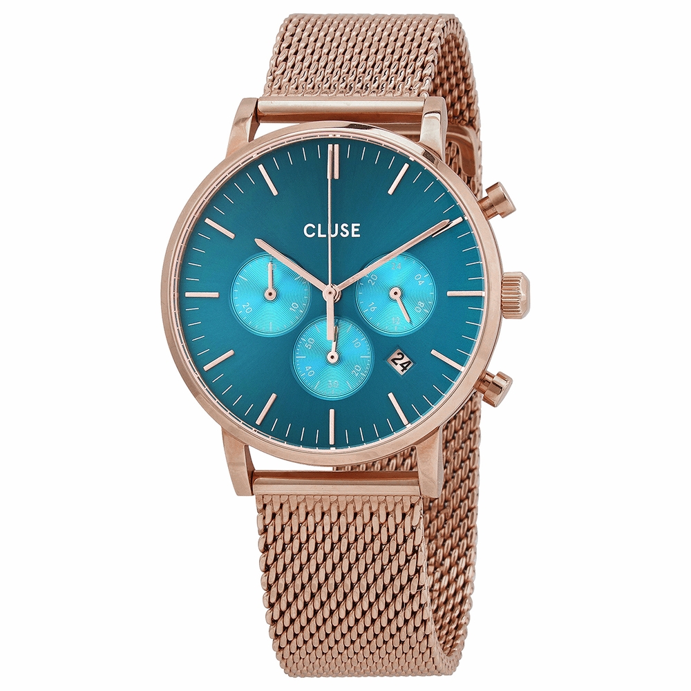 Rose gold-tone stainless steel case with a rose gold-tone stainless steel mesh bracelet. Fixed rose gold-tone bezel. Blue dial with rose gold-tone hands and index hour markers. Minute markers around the rim. Dial Type: Analog. Date display between the 4 and 5 o'clock positions. Chronograph - three sub-dials displaying: 60 second, 30 minute and 24 hour. Quartz movement. Scratch resistant mineral crystal. Pull / push crown. Solid case back. Round case shape. Case size: 40 mm. Case thickness: 11.2 mm. Band width: 20 mm. Fold over slip through clasp. Water resistant at 50 meters / 165 feet. Functions: chronograph, date, hour, minute, second. Aravis Series. Casual watch style. Cluse Aravis Chronograph Quartz Blue Dial Mens Watch CW0101502005.