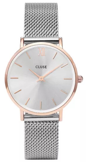 Rose gold-tone stainless steel case with a silver-tone stainless steel mesh bracelet. Fixed rose gold-tone bezel. Silver dial with rose gold-tone hands and index hour markers. A Roman numeral appears at the 12 o'clock position. Dial Type: Analog. Quartz movement. Scratch resistant mineral crystal. Pull / push crown. Solid case back. Round case shape. Case size: 33 mm. Case thickness: 7 mm. Band width: 16 mnm. Fold over slip through (milanese) clasp. Water resistant at 30 meters / 100 feet. Functions: hour, minute. La Minuit 33 Series. Casual watch style. Cluse La Minuit 33 Quartz Silver Dial Ladies Watch CW0101203004.