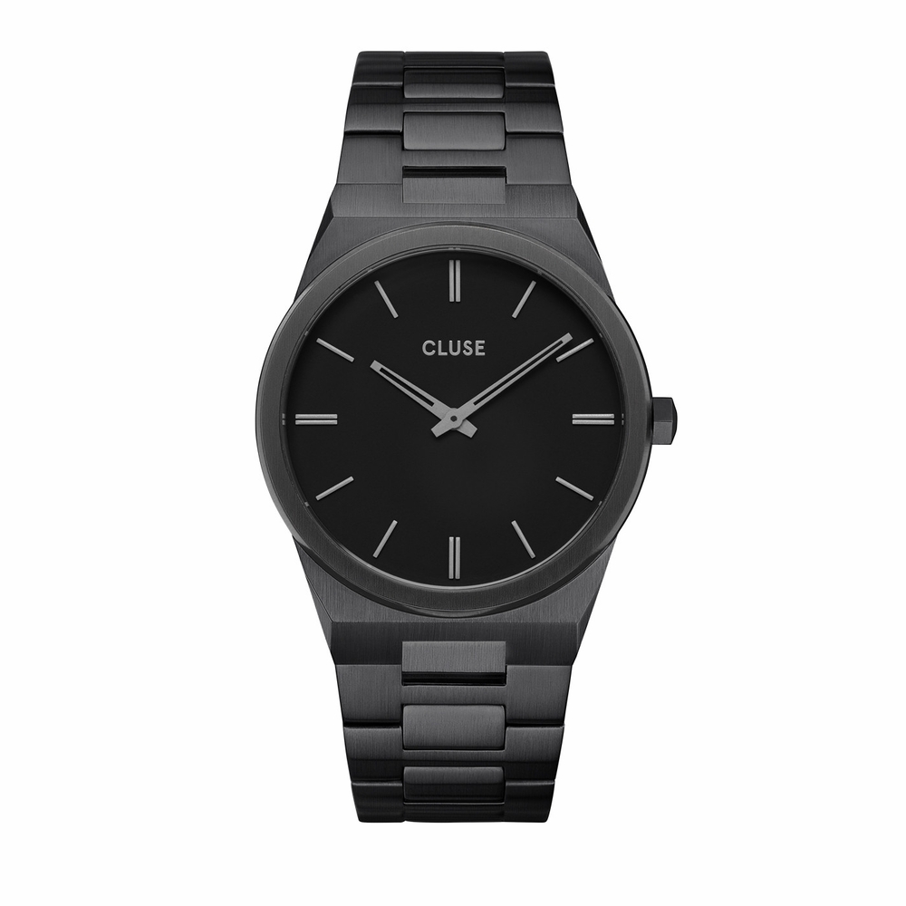 Black-plated stainless steel case and bracelet. Fixed black-plated bezel. Black dial with gunmetal hands and index hour markers. Dial Type: Analog. Quartz movement. Scratch resistant mineral crystal. Solid case back. Round case shape. Case size: 40 mm. Case thickness: 7 mm. Band width: 24 mm. Fold over clasp with a push button release. Water resistant at 30 meters / 100 feet. Functions: hour, minute. Vigoureaux Series. Casual watch style. Cluse Vigoureaux Quartz Black Dial Mens Watch CW0101503005.