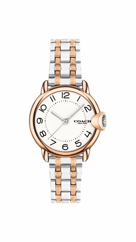 Rose gold-tone stainless steel case with a two-tone (silver-tone and rose gold-tone) stainless steel bracelet. Fixed rose gold-tone bezel. White dial with silver-tone hands and Arabic numeral hour markers. Minute markers around an inner ring. Dial Type: Analog. Quartz movement. Scratch resistant mineral crystal. Pull / push crown. Solid case back. Round case shape. Case size: 28 mm. Case thickness: 8.5 mm. Band width: 13 mm. Fold over clasp with a push button release. Water resistant at 30 meters / 100 feet. Functions: hour, minute, second. Arden Series. Casual watch style. Coach ARDEN White Dial Ladies Watch 14503604.