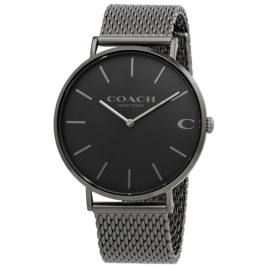 Grey stainless steel case with a grey stainless steel mesh bracelet. Fixed grey stainless steel bezel. Black dial with silver-tone hands and index hour markers. Dial Type: Analog. Quartz movement. Scratch resistant mineral crystal. Pull / push crown. Solid case back. Round case shape, case size: 41 mm, case thickness: 8 mm. Band width: 20 mm. Fold over with safety release clasp. Water resistant at 30 meters / 100 feet. Functions: hour, minute. Casual watch style. Watch label: Japan Movt. Coach Charles Quartz Black Dial Mens Watch 14602145.