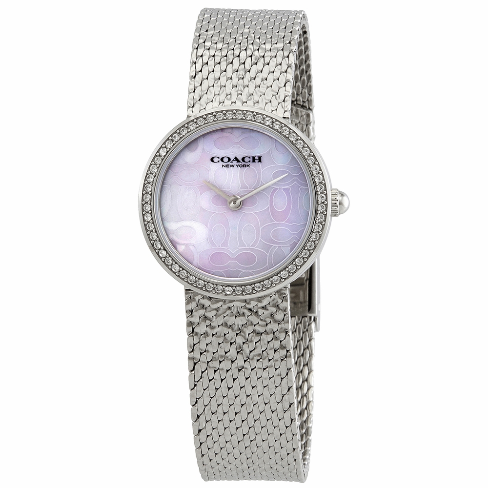 Stainless steel case with a stainless steel bracelet. Fixed stainless steel bezel set with crystals. Blue mother of pearl dial with silver-tone hands. No markers. Dial Type: Analog. Quartz movement. Scratch resistant mineral crystal. Pull / push crown. Solid case back. Round case shape. Case size: 27 mm. Case thickness: 7.2 mm. Band width: 15 mm. Fold over slide through clasp. Water resistant at 30 meters / 100 feet. Hayley Series. Casual watch style. Watch label: Swiss Made. Coach Hayley Quartz Crystal Mother of Pearl Dial Ladies Watch 14503439.