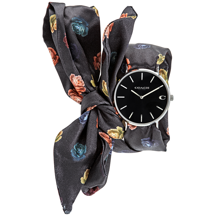 Silver-tone stainless steel case with a black floral satin scarf wrap strap. Fixed silver-tone stainless steel bezel. Black dial with silver-tone hands and index hour markers. Dial Type: Analog. Quartz movement. Scratch resistant mineral crystal. Pull / push crown. Solid case back. Round case shape, case size: 36 mm, case thickness: 7 mm. Band width: 18 mm. Buckle clasp. Water resistant at 30 meters / 100 feet. Functions: hour, minute. Dress watch style. Watch label: Japan Movt. Coach Perry Quartz Black Dial Satin Peony Scarf Ladies Watch 14503182.