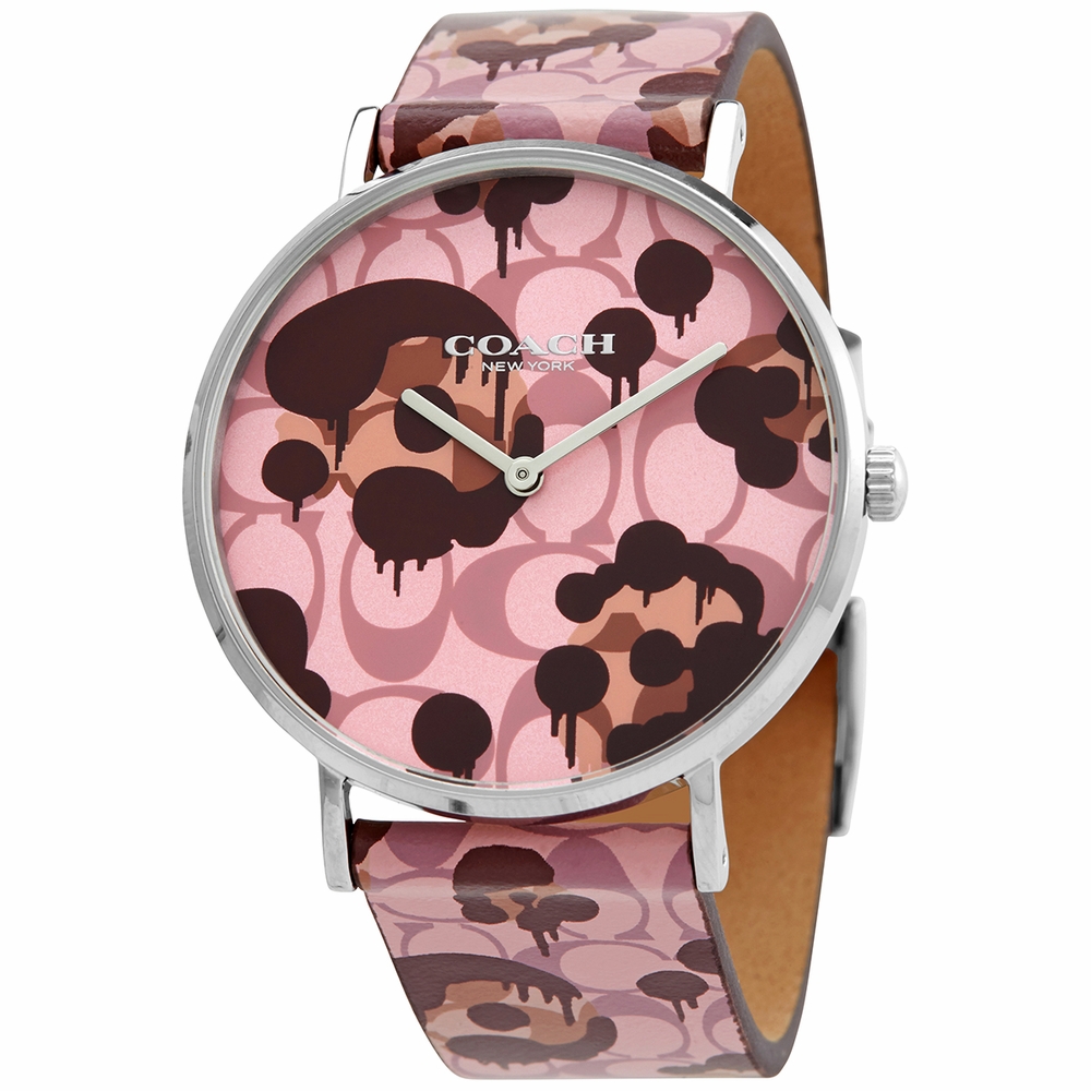 Stainless steel case with a pink and brown patterned (calfskin) leather strap. Fixed stainless steel bezel. Pink and brown patterned dial with silver-tone hands. No markers. Dial Type: Analog. Quartz movement. Scratch resistant mineral crystal. Pull / push crown. Solid case back. Round case shape. Case size: 36 mm. Case thickness: 7.50 mm. Band width: 18 mm. Tang clasp. Water resistant at 30 meters / 100 feet. Functions: hour, minute. Casual watch style. Watch label: Japan Movt. Coach Perry Quartz Pink and Brown Patterened Dial Ladies Watch 14503246.