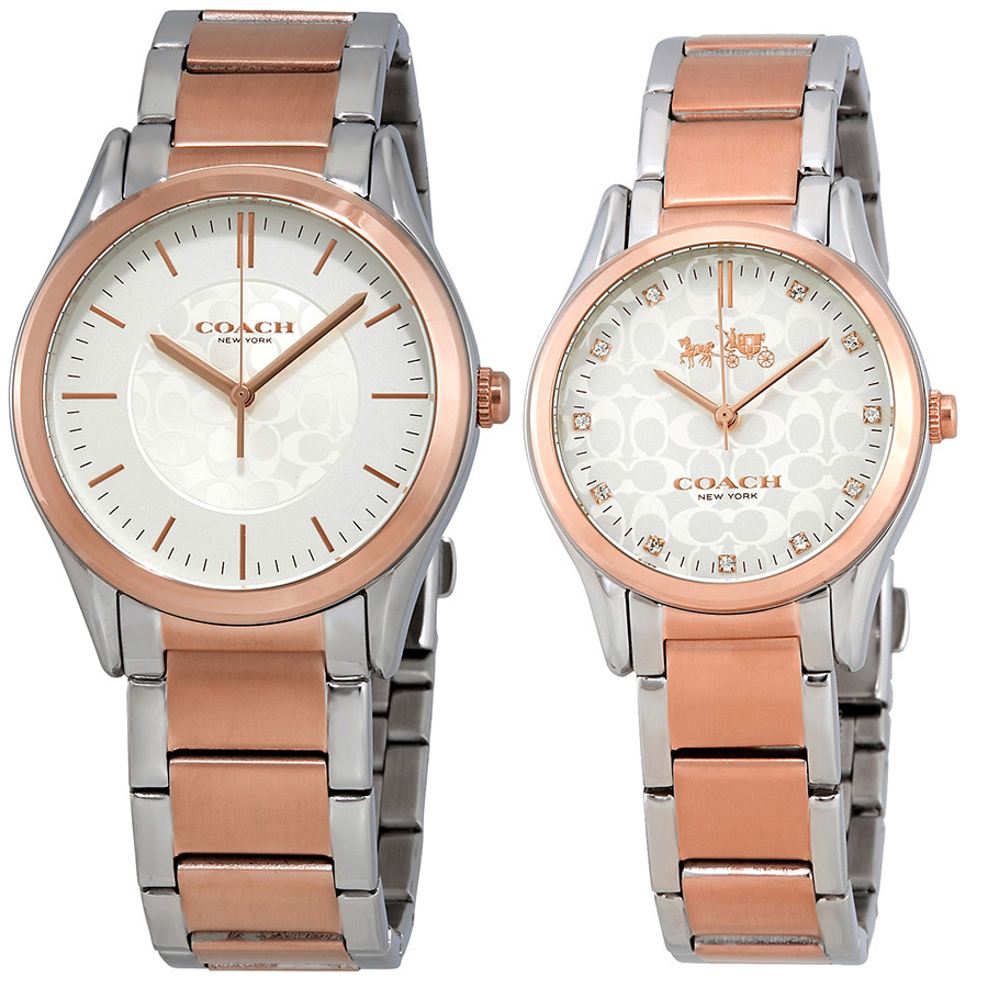 Silver-rose gold-tone stainless steel case with a silver-rose gold-tone stainless steel bracelet. Fixed bezel. Silver dial with rose gold-tone hands. Dial Type: Analog. Quartz movement. Scratch resistant mineral crystal. Solid case back. Round case shape. Water resistant at 30 meters / 100 feet. Functions: hour, minute, second. Casual watch style. Coach Silver Dial Ladies/Mens Two Tone Watch Set 14000051.