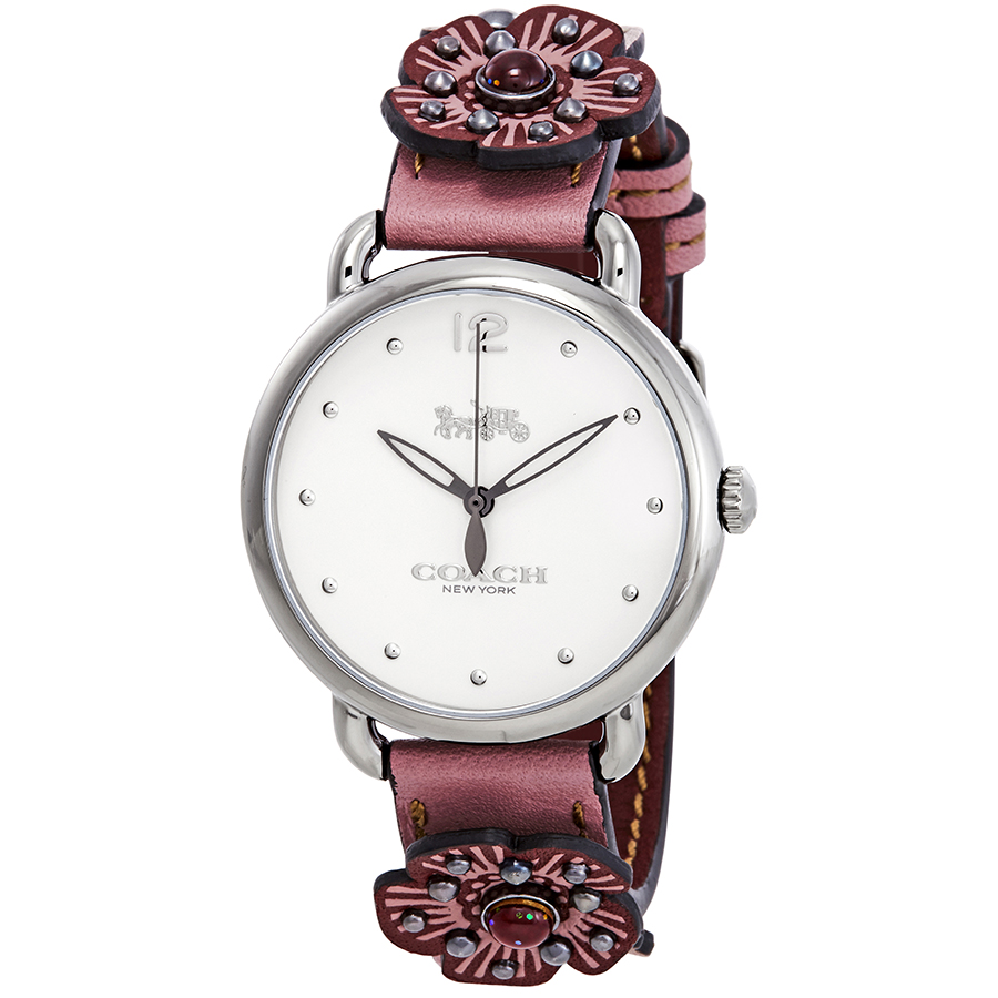 Grey ion-plated stainless steel case with a pink leather strap featuring pink flower appliques. Fixed grey ion-plated bezel. Silver dial with grey skeleton hands and dot hour markers. An Arabic numeral appears at the 12 o'clock position. Dial Type: Analog. Quartz movement. Scratch resistant mineral crystal. Pull / push crown. Solid case back. Round case shape. Case size: 31 mm. Case thickness: 8 mm. Band width: 14 mm. Tang clasp. Water resistant at 30 meters / 100 feet. Functions: hour, minute, second. Dress watch style. Coach Delancey Silver Dial Pink Leather Ladies Watch 14502949.
