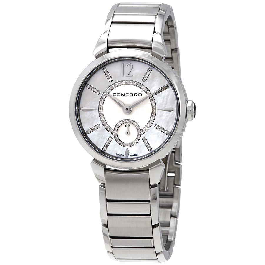 Stainless steel case with a stainless steel bracelet. Fixed stainless steel bezel. White mother of pearl (diamond-set) dial with silver-tone hands and diamond-set index hour markers. An Arabic numeral appears at the 12 o'clock position. Dial Type: Analog. Diamond-set small second sub-dial. Quartz movement. Scratch resistant sapphire crystal. Pull / push crown. Solid case back. Round case shape. Case size: 32 mm. Case thickness: 8 mm. Band width: 16 mm. Deployment clasp with a push button release. Water resistant at 50 meters / 165 feet. Functions: hour, minute, small second. Additional Info: 98 diamonds on dial / 0.125ct. Dress watch style. Watch label: Swiss Made. Concord Impresario Diamond White Mother of Pearl Dial Ladies Watch 0320383.