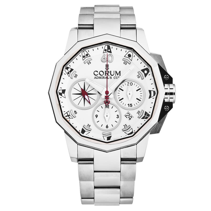 Silver-tone stainless steel case and bracelet. Fixed silver-tone stainless steel bezel. White dial with silver-tone hands and index hour markers. Minute markers around the outer rim. Dial Type: Analog. Luminescent hands and markers. Date display between 4 and 5 o'clock position. Chronograph - three sub-dials displaying: 60 second, 30 minute and 12 hour. Corum Calibre CO 753 Automatic movement, containing 27 Jewels, bitting at 28800 vph, and has a power reserve of approximately 48 hours. Scratch resistant sapphire crystal. Screw down crown. Transparent see through case back. Dodecagon case shape, case size: 44 mm, case thickness: 16 mm. Band width: 22 mm, band length: 8 inches. Deployment with push button release clasp. Water resistant at 100 meters / 330 feet. Functions: chronograph, date, hour, minute, second, chronometer. Admiral Cup Series. Luxury watch style. Watch label: Swiss Made. Corum Admiral Cup Chronograph Automatic Chronometer White Dial Mens Watch A753/04257.