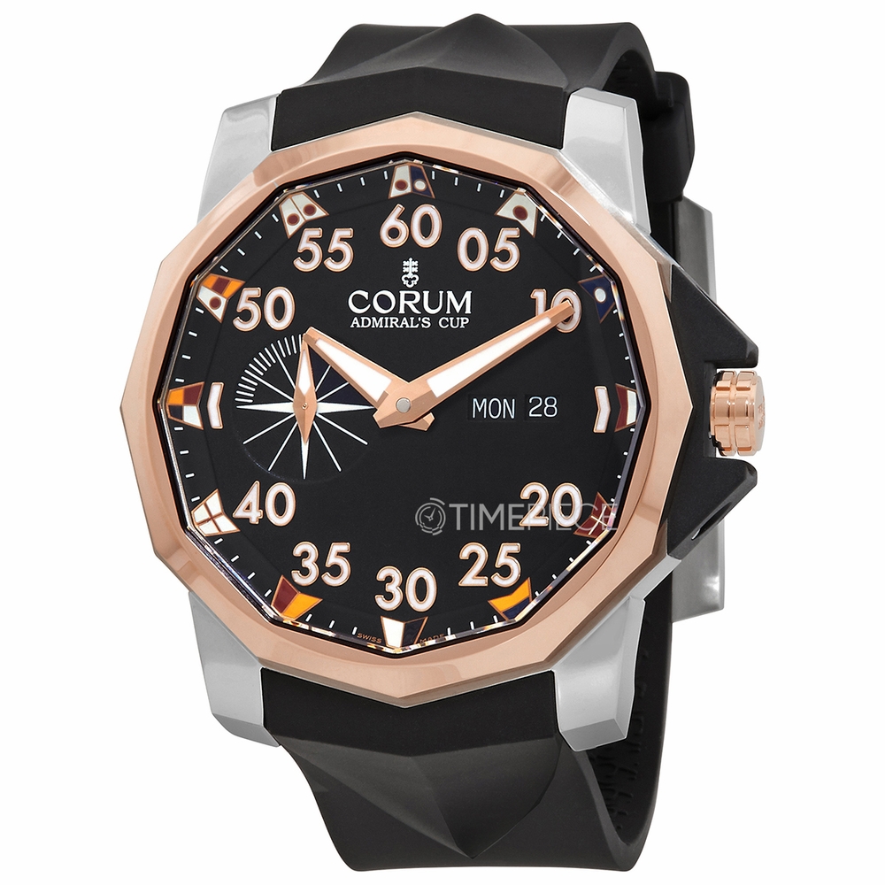 . Titanium case with a black rubber strap. Fixed rose gold bezel. Black dial with rose gold-tone hands and nautical flag hour markers. Arabic numeral minute markers (at 5 minute intervals). Minute markers around the outer rim. Dial Type: Analog. Luminescent hands and markers. Day of the week and date display at the 3 o'clock position. One subdial displaying: small second. Corum Calibre CO 690 automatic movement. Scratch resistant sapphire crystal. Protected crown. Solid case back. Dodecagon case shape, case size: 48 mm, case thickness: 17 mm. Band width: 24 mm. Tang clasp. Water resistant at 30 meters / 100 feet. Functions: date, hour, minute, second. Admirals Cup Competition Series. Sport watch style. Watch label: Swiss Made. Corum Admirals Cup Competition Automatic Black Dial Mens Watch A690/04311.