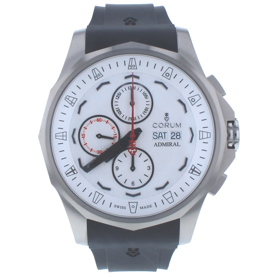 Grey titanium case with a blue rubber strap. Fixed grey titanium bezel. White dial with black hands and index hour markers. Minute markers around the outer rim. Dial Type: Analog. Day of the week and date display at the 3 o'clock position. Chronograph - three sub-dials displaying: 60 second, 30 minute and 12 hour. Automatic movement. Scratch resistant sapphire crystal. Dodecagon case shape, case size: 47 mm. Water resistant at 100 meters / 330 feet. Functions: chronograph, date, day, hour, minute, second. Admirals Cup Series. Sport watch style. Watch label: Swiss Made. Corum Admirals Cup Legend Chronograph Automatic White Dial Watch A077/04178.
