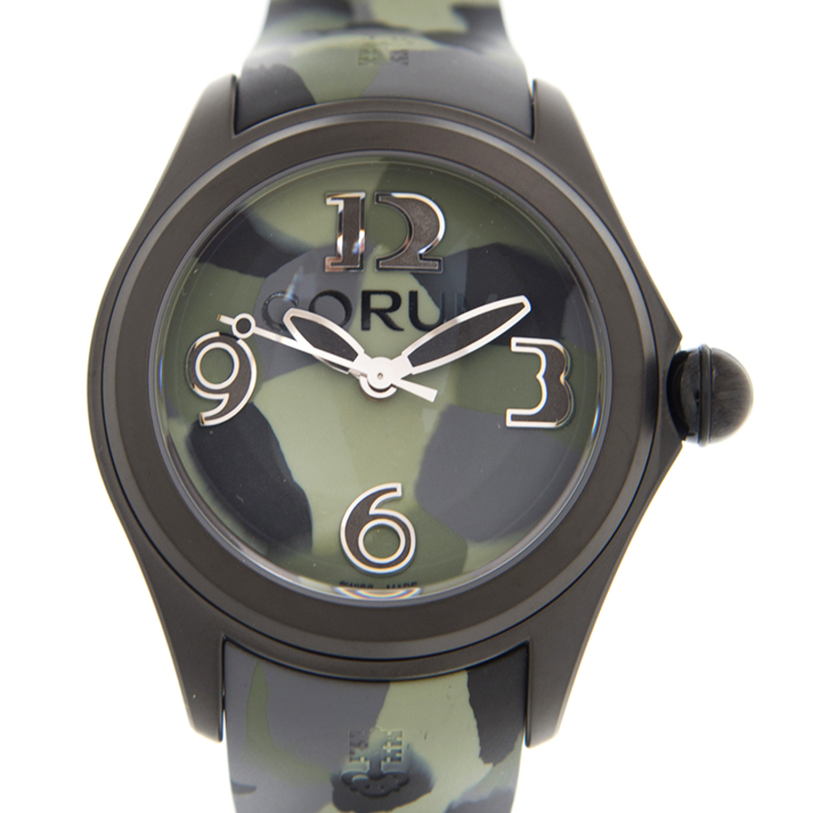 Black stainless steel case with a camouflage rubber strap. Fixed black stainless steel bezel. Camouflage dial with silver-tone leaf-style shape hands and Arabic numeral hour markers. Dial Type: Analog. Corum Calibre CO 082 Automatic movement, based upon Soprod A10, containing 21 Jewels, bitting at 28800 vph, and has a power reserve of approximately 42 hours. Scratch resistant sapphire crystal. Pull / push crown. Transparent case back. Round case shape, case size: 47 mm. Band width: 24 mm. Pin buckle clasp. Water resistant at 30 meters / 100 feet. Functions: hour, minute, second. Bubble Series. Sport watch style. Watch label: Swiss Made. Corum Bubble Automatic Watch 082.310.98/0177 CA02.