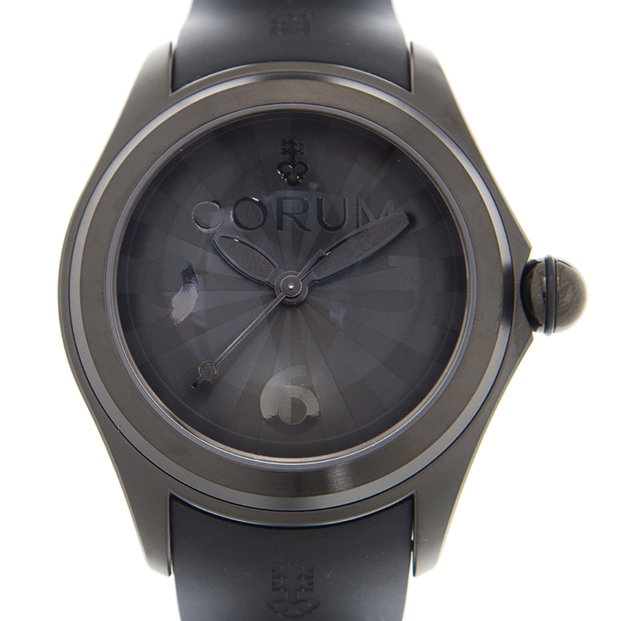 Black stainless steel case with a black rubber strap. Fixed black stainless steel bezel. Black dial with black hands and Arabic numeral hour markers. Dial Type: Analog. Corum Calibre CO 082 Automatic movement, based upon Soprod A10, containing 21 Jewels, bitting at 28800 vph, and has a power reserve of approximately 42 hours. Scratch resistant sapphire crystal. Transparent case back. Round case shape. Case size: 47 mm. Tang clasp. Water resistant at 100 meters / 330 feet. Functions: hour, minute, second. Additional Info: original box, international warranty card, manual (complete accessories). Luxury watch style. Watch label: Swiss Made. Corum Bubble Black Dial Unisex Watch 082.310.98/0371 BB01.