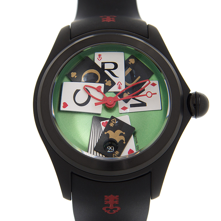 Black titanium case with a black rubber strap. Fixed black titanium bezel. Green (card) dial with red leaf-style hands. No markers. Dial Type: Analog. Date display at the 6 o'clock position. Corum calibre CO 082 automatic movement, based upon Soprod A10, containing 21 Jewels, bitting at 28800 vph, and has a power reserve of approximately 42 hours. Scratch resistant sapphire crystal. Push / pull crown. Transparent case back. Round case shape, case size: 47 mm. Tang clasp. Water resistant at 100 meters / 330 feet. Functions: date, hour, minute, second. Additional Info: original box, manual (complete accessories). Bubble Series. Luxury watch style. Watch label: Swiss Made. Corum Bubble Game Automatic Watch 082.310.98/0371 GC02.