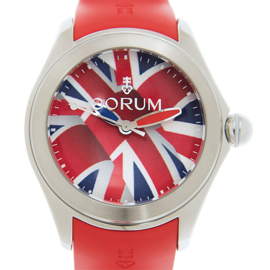 Silver-tone stainless steel case with a red rubber strap. Fixed silver-tone stainless steel bezel. Red dial with silver-tone hands and index hour markers. Minute markers around the outer rim. Dial Type: Analog. Corum Calibre CO 403 Automatic movement, containing 30 Jewels, bitting at 28800 vph, and has a power reserve of approximately 65 hours. Scratch resistant sapphire crystal. Transparent case back. Round case shape, case size: 42 mm, case thickness: 16.5 mm. Band width: 22 mm. Buckle clasp. Water resistant at 100 meters / 330 feet. Functions: hour, minute, second. Additional Info: original box, international warranty card, manual (complete accessories). Bubble series. Luxury watch style. Watch label: Swiss Made. Corum Bubble Automatic UK Flag Red Dial Unisex Watch 082.410.20/0376 UK01.