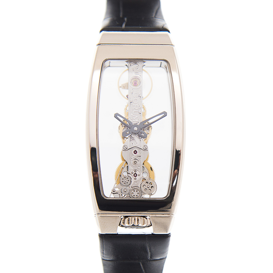 18kt white gold case with a black alligator band. Fixed 18kt white gold bezel. Transparent dial with black hands. Dial Type: Analog. Corum Calibre CO 113 Hand Wind movement, containing 19 Jewels, bitting at 28800 vph, and has a power reserve of approximately 40 hours. Scratch resistant sapphire crystal. Transparent case back. Tonneau case shape, case size: 21.30 mm, case thickness: 11.24 mm. Buckle clasp. Water resistant at 30 meters / 100 feet. Functions: hour, minute. Additional Info: original box, international warranty card, manual (complete accessories). Miss golden bridge series. Luxury watch style. Watch label: Swiss Made. Corum Miss Golden Bridge Hand Wind Unisex Watch 113.101.59/0001 0000.