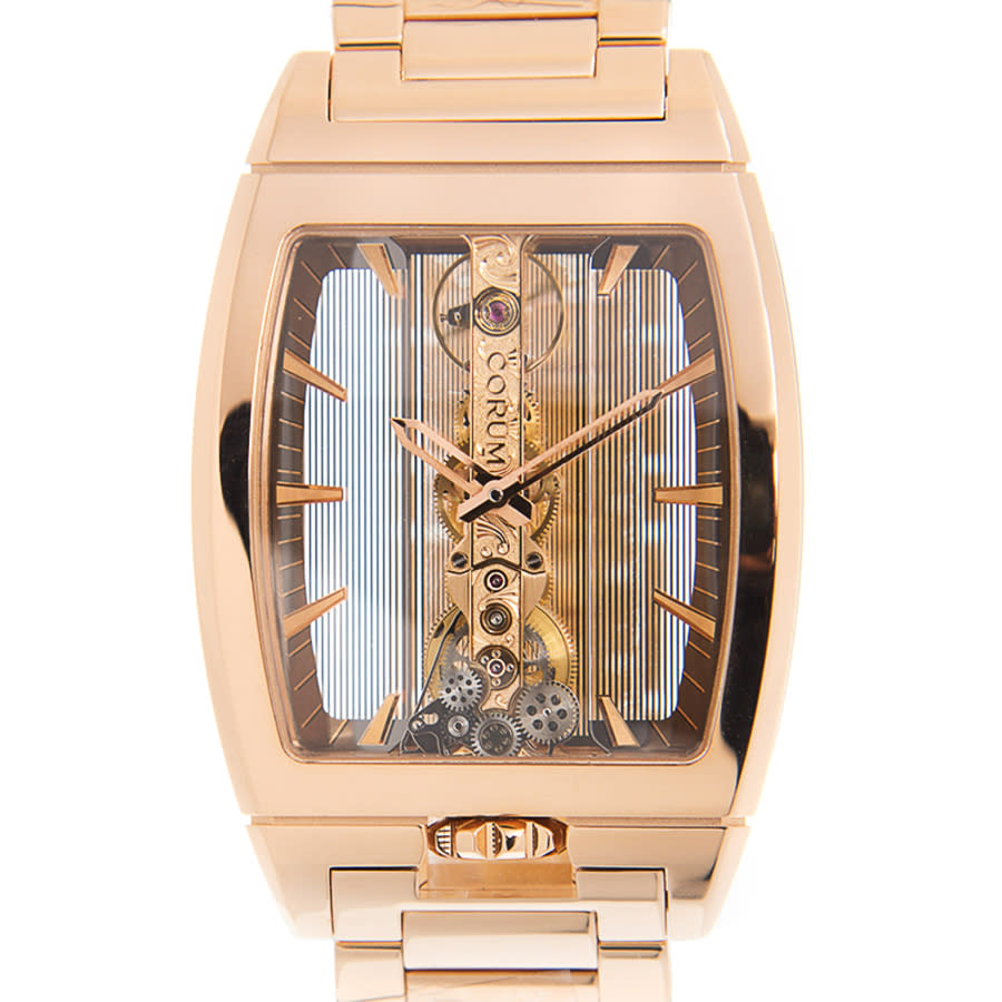 18kt rose gold case with a 18kt rose gold bracelet. Fixed 18kt rose gold bezel. Transparent dial with rose gold skeleton hands and index hour markers. Minute markers around the outer rim. Dial Type: Analog. Corum calibre CO 113 hand wind movement, containing 19 Jewels, bitting at 28800 vph, and has a power reserve of approximately 40 hours. Scratch resistant sapphire crystal. Transparent case back. Tonneau case shape. Case dimensions: 34 mm x 51 mm. Case thickness: 10.9 mm. Butterfly clasp. Water resistant at 30 meters / 100 feet. Functions: hour, minute. Additional Info: original box, manual (complete accessories). Golden Bridge Series. Luxury watch style. Watch label: Swiss Made. Corum GOLDEN BRIDGE Transparent Dial Unisex Watch 113.165.55\V100G L10R.