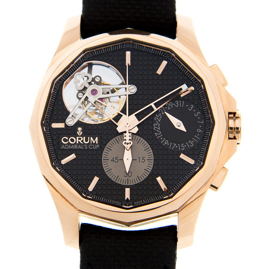 18kt rose gold case with a black fabric strap. Fixed 18kt rose gold bezel. Black dial with gold-tone skeleton hands and index hour markers. Minute markers around the outer rim. Dial Type: Analog. Date display at the 3 o'clock position. Three sub-dials displaying: tourbillon, 60 minute and date. Corum Calibre CO 398 Automatic movement, containing 28 Jewels, bitting at 28800 vph, and has a power reserve of approximately 45 hours. Scratch resistant sapphire crystal. Transparent case back. Dodecagon case shape, case size: 47 mm. Tang clasp. Water resistant at 50 meters / 165 feet. Functions: tourbillon, chronograph, date, hour, minute, small second. Admirals Cup Series. Luxury watch style. Watch label: Swiss Made. Corum Admirals Cup Tourbillon Chronograph Automatic Black Dial Mens Watch 398.550.55/0001 AN10.