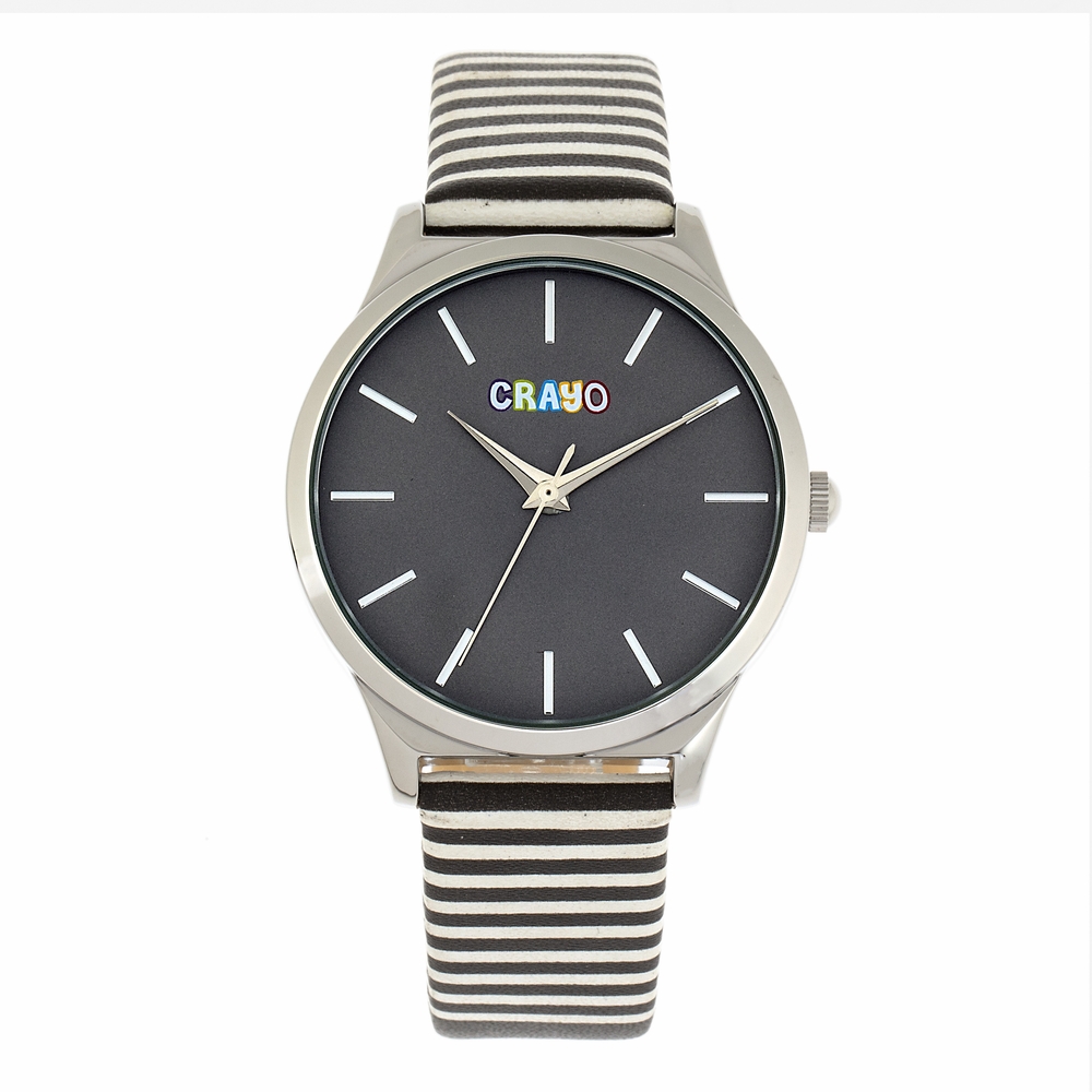Silver-tone alloy case with a black leatherette strap. Fixed silver-tone alloy bezel. Grey dial with silver-tone hands and index hour markers. Dial Type: Analog. Quartz movement. Scratch resistant mineral crystal. Pull / push crown. Solid case back. Round case shape, case size: 38 mm, case thickness: 9 mm. Band width: 18 mm. Buckle clasp. Water resistant at 30 meters / 100 feet. Functions: hour, minute, second. Casual watch style. Watch label: Japan Movt. Crayo Aboard Quartz Grey Dial Unisex Watch CRACR5605.