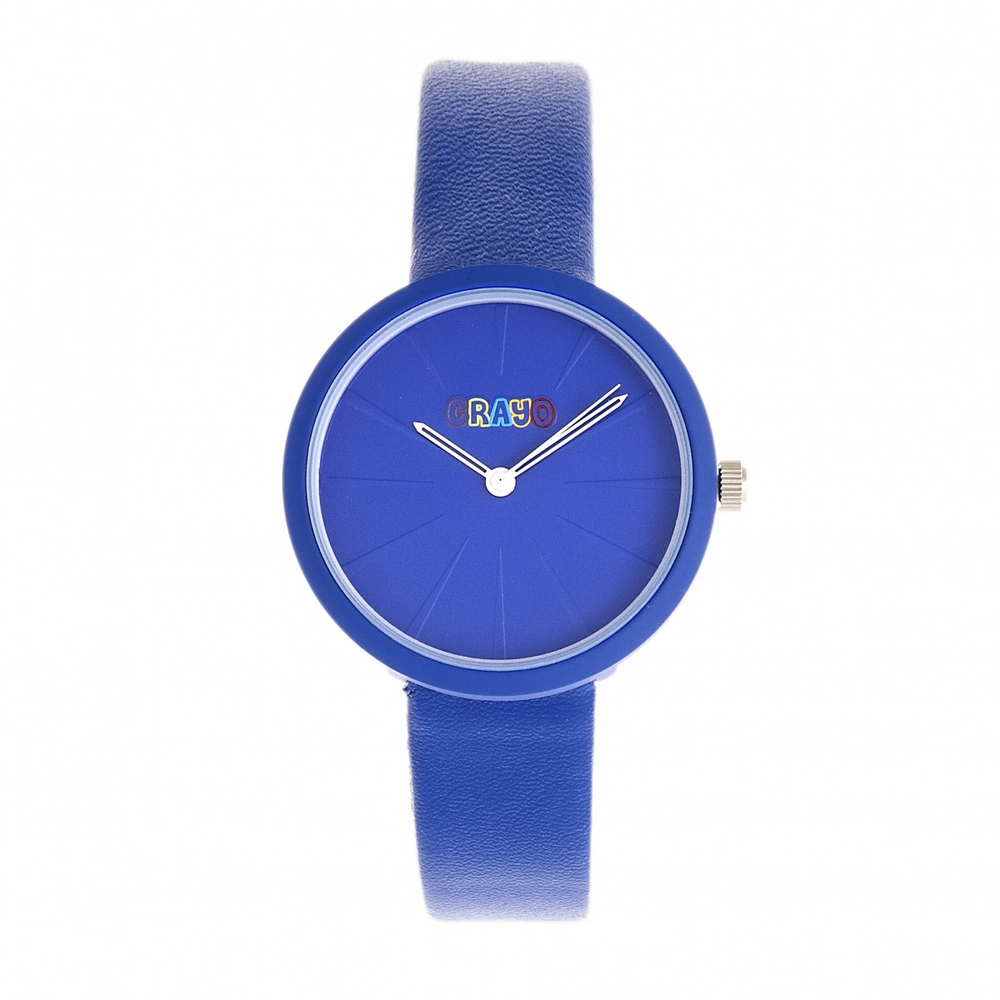 Blue alloy case with a blue leatherette strap. Fixed blue alloy bezel. Blue dial with silver-tone hands. Dial Type: Analog. Quartz movement. Scratch resistant mineral crystal. Pull / push crown. Solid case back. Round case shape, case size: 37 mm, case thickness: 8 mm. Band width: 11 mm. Buckle clasp. Water resistant at 30 meters / 100 feet. Functions: hour, minute, second. Casual watch style. Watch label: Japan Movt. Crayo Blade Quartz Blue Dial Watch CRACR5404.